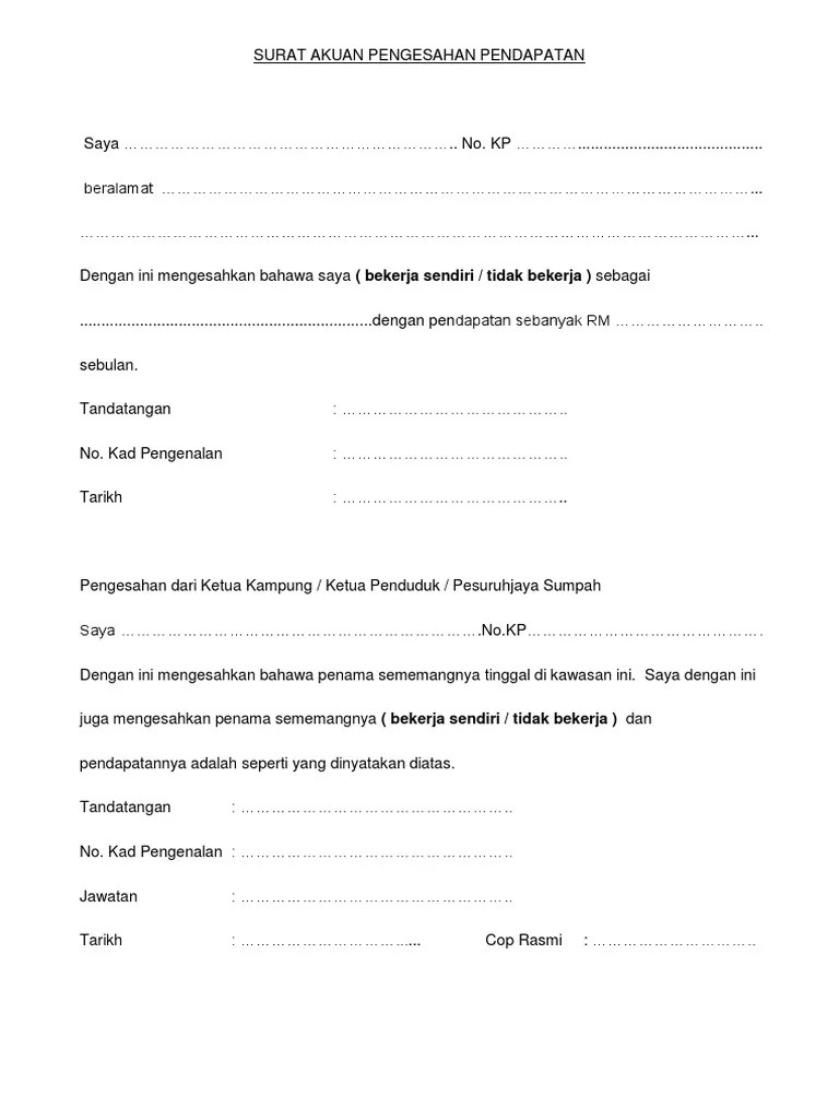 Surat akuan pengesahan pendapatan adalah khusus buat individu yang bekerja sendiri dan tidak mempunyai slip gaji.